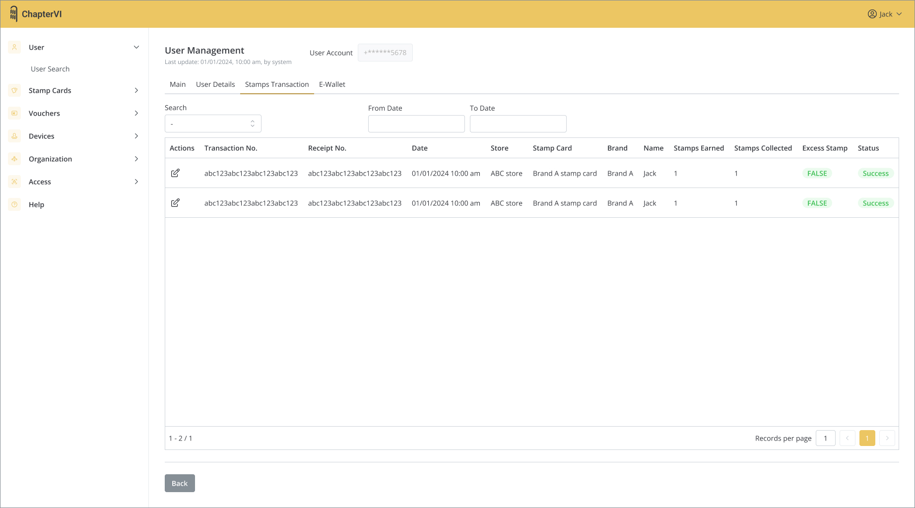 Similar to issue stamp, search for user then click on “Stamp Transactions”.