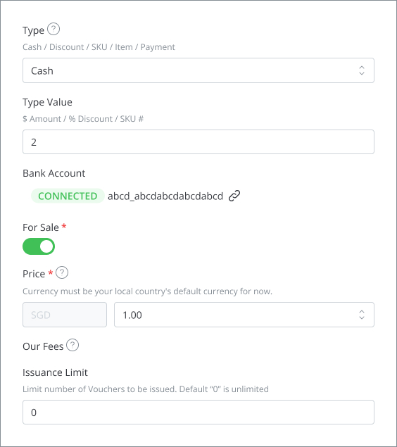 7. Go to the voucher page and add a voucher. Look for the “For Sale” option, and you should now be able to toggle it to Green and allow you to set a Price.